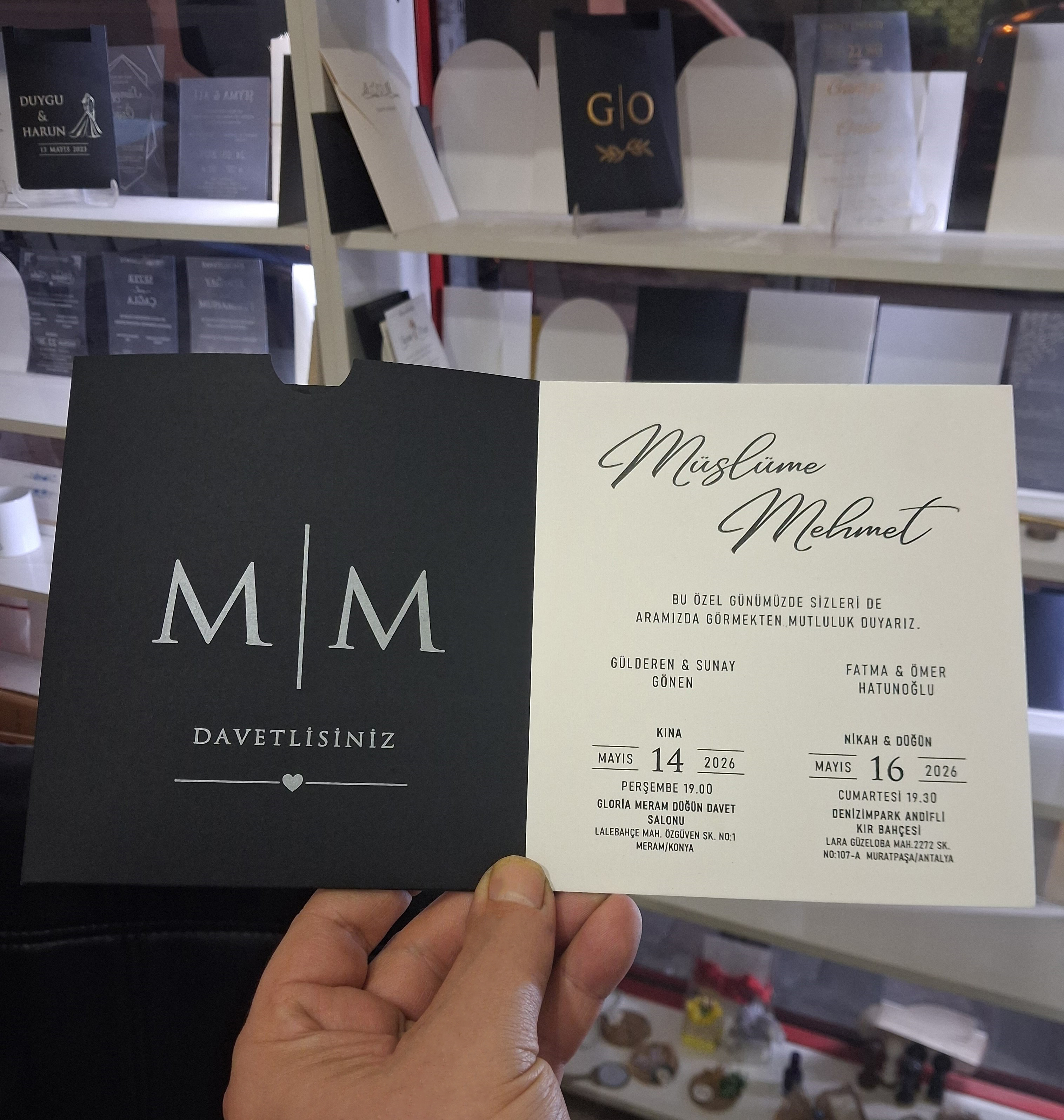• Davetiyeler görselde görüldüğü gibidir; davetiye aksesuarları ve zarflar, ürün görselinde yer alıyorsa fiyata dahildir.